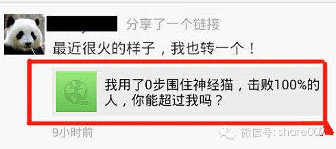 其實(shí)原理很簡(jiǎn)單,就是自己編輯一篇文章,題目要寫(xiě)的和玩游戲之后分享的一模一樣,然后把數字改為0,然后用自己的私人微信號轉發(fā)到朋友圈就可以了。在大家都刷屏玩,結果最多的也只能6步逮到神經(jīng)貓的時(shí)候,你來(lái)個(gè)0步,吸引力肯定很強。一方面是借勢了社交媒體的熱事件,另一方面,又借助了大家對這種分享攀比愛(ài)面子的心理。