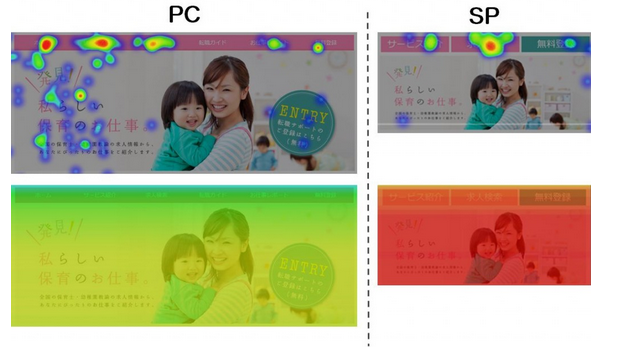 點(diǎn)擊熱點(diǎn)集中在banner的左側。但是左側沒(méi)有鏈接,只有文字展示。相反,右側有注冊按鈕但卻幾乎沒(méi)有點(diǎn)擊熱點(diǎn)。由于注冊按鈕是轉化的入口,所以作為網(wǎng)站來(lái)說(shuō),是必須進(jìn)行改善的部分。預測的原因詳見(jiàn)下面所述。