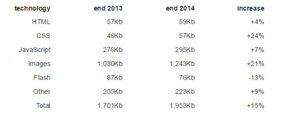 隨著(zhù)基礎設施的發(fā)展,我們的網(wǎng)速是越來(lái)越快了,那你是否感受到網(wǎng)頁(yè)加載速度變快了呢?有沒(méi)有想過(guò),網(wǎng)頁(yè)也在逐漸變臃腫?根據HTTP Archive的報告,在調查了約50萬(wàn)網(wǎng)頁(yè)后,他們發(fā)現每個(gè)網(wǎng)頁(yè)的平均容量稍小于2Mb,達到了1953Kb,比去年上升了15%。 當然,調查的網(wǎng)站不包括那邊復雜的網(wǎng)頁(yè)應用。去年,這一上升比例是32%,雖然今年幅度縮小,但同樣不令人樂(lè )觀(guān)。