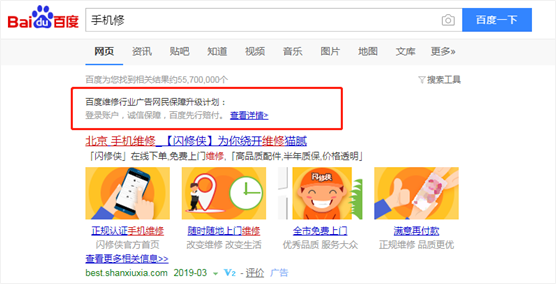 以后網(wǎng)民在搜索上點(diǎn)擊手機維修、家電維修、浴霸維修等3C維修廣告時(shí),再也不用擔心了!3月13日,百度發(fā)布維修行業(yè)網(wǎng)民權益保障升級計劃,用戶(hù)在登錄百度賬號后,點(diǎn)擊3C維修廣告受到虛假欺詐的情況,能夠付一賠三,同時(shí)百度承諾將先行賠付。