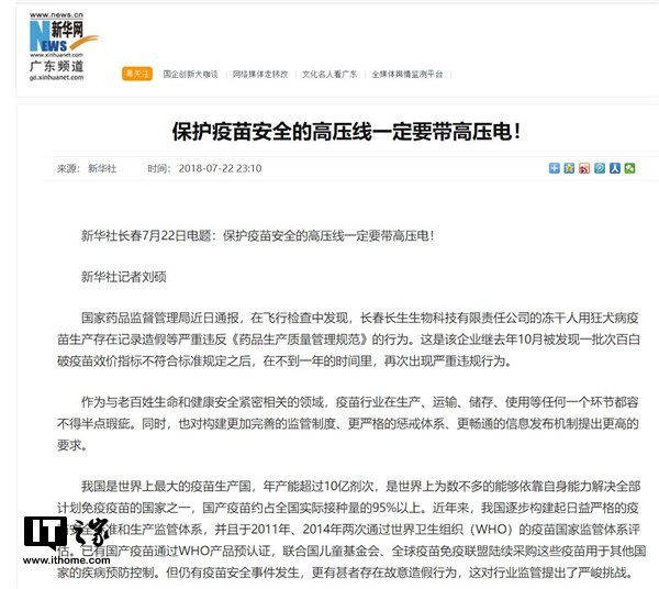 IT之家7月23日消息 這幾天,問(wèn)題疫苗引發(fā)了全社會(huì )的熱烈關(guān)注,同時(shí)官方以及政府也對問(wèn)題疫苗進(jìn)行了表態(tài),而今天早上,新華社發(fā)表評論,稱(chēng)社會(huì )需要加大處罰力度,要讓違法者傾家蕩產(chǎn)。新華社首先點(diǎn)明了背景,稱(chēng)國家藥品監督管